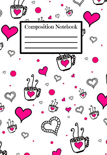 7.5 x 9.25 Composition Book Notebook with 110 blank lined pages and super cute coffee and pink hearts doodle art created by myself on the cover.