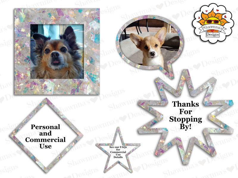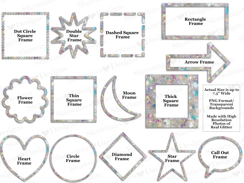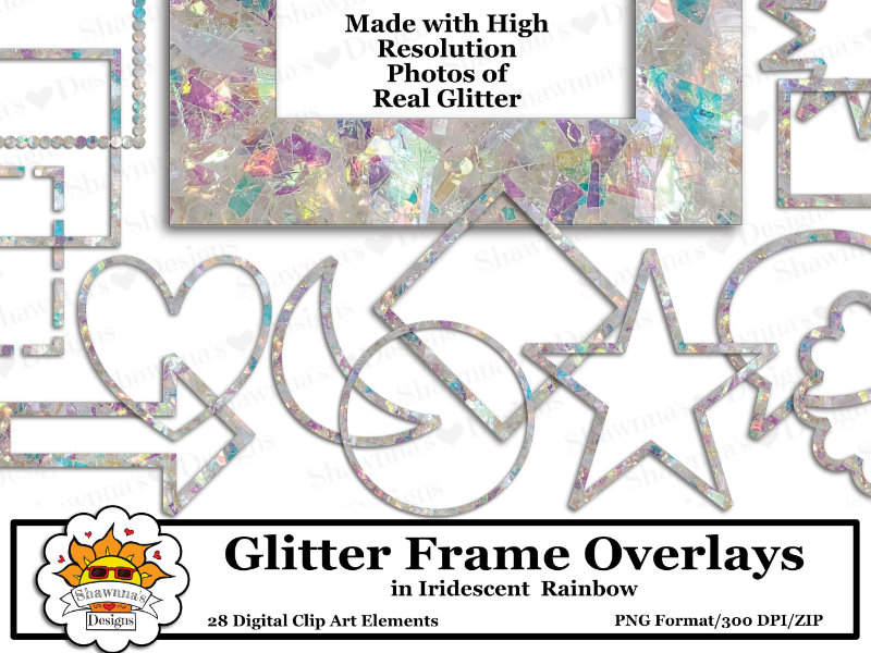 This new Iridescent Rainbow Glitter Frame Overlay set comes in 28 separate digital clip art elements with transparent backgrounds (PNG Format/300 DPI), and is available in 8 colors currently, with more on the way. There are 2 – 14 frame shapes sets, 1 set includes a drop shadow, and 1 set does not.