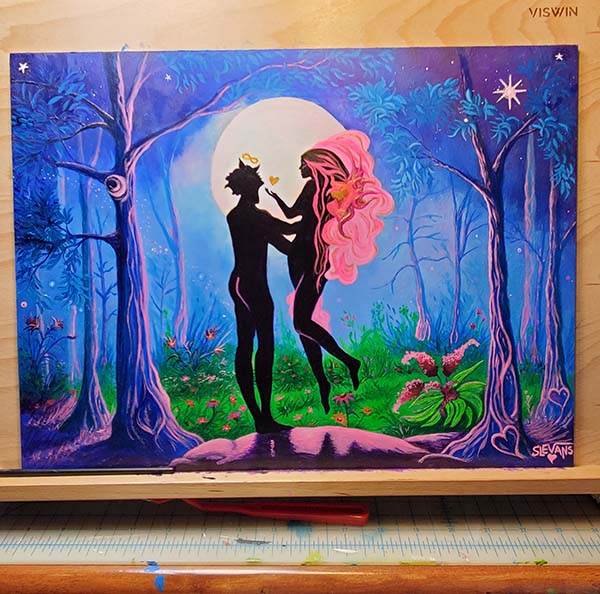 After I completed my God and Goddess painting series, I decided to go back and dive deeper into AI Art. You see, as an experiment, I used AI to formulate my composition idea to create that painting. At the time I had this song stuck in my head for weeks, as well as this story idea about an eternal love between a God and Goddess. The feeling of this song matched my story idea, and I wanted to bring that feeling to life somehow. The song is called “1 am” by the band Engine, I will link it at the end of this post. So as an experiment, I learned how to communicate with AI by writing properly written prompts to tell my stories to AI to create these ideas out of thin air for me. To my sheer delight, it worked like a charm as it conveyed the feeling so well that I wanted to capture. Next was to take that image it came up with and create my painting composition from it. The results of which was my God and Goddess painting series, which I also published in videos on my Instagram page.